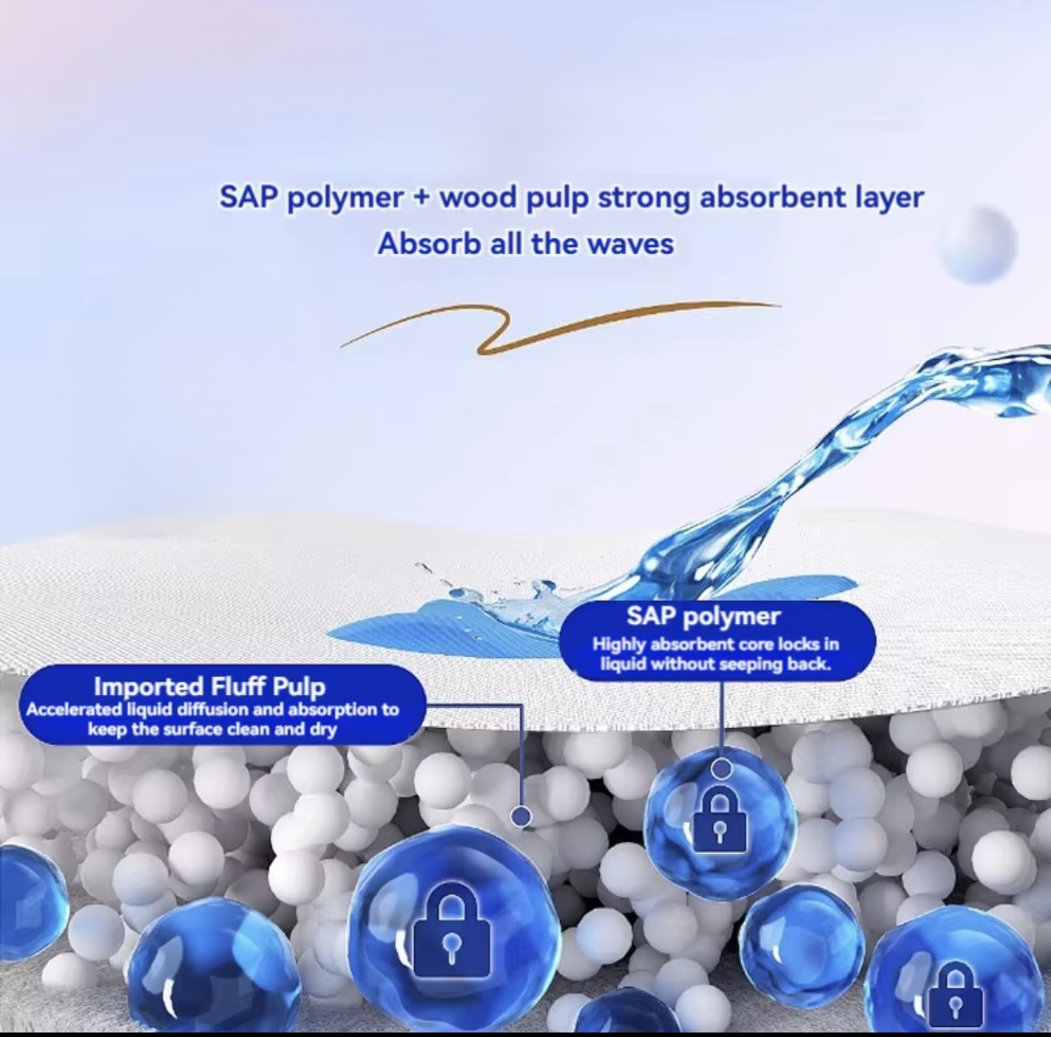 SAP polymer and fluff pulp work together to rapidly absorb and lock in liquid, keeping the surface clean, dry, and leak-free.
