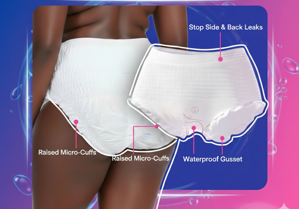 Raised micro-cuffs + waterproof gusset stop side and back leaks better than disposables.